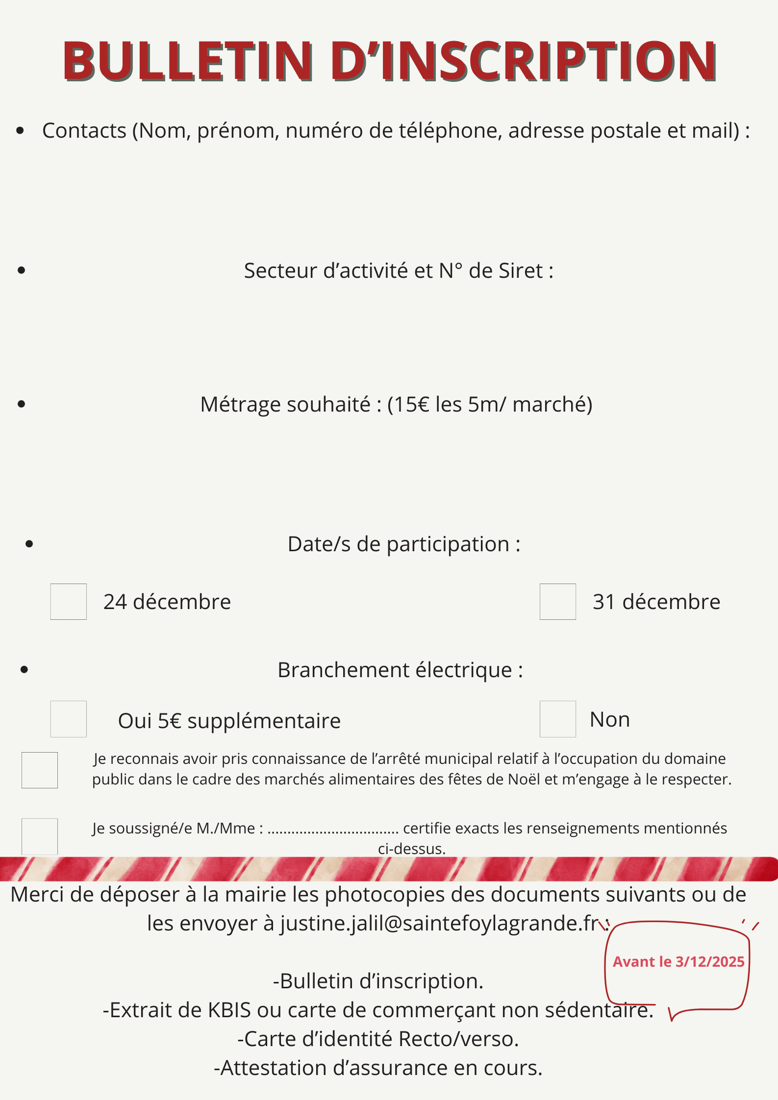 Vous êtes producteur ou commerçant et souhaitez participer ? Vous devez compléter le bulletin d'inscription disponible ci-dessous (ou en mairie) et fournir les documents demandés avant le 3 décembre. Vous serez ensuite rapidement contacté pour valider votre participation.