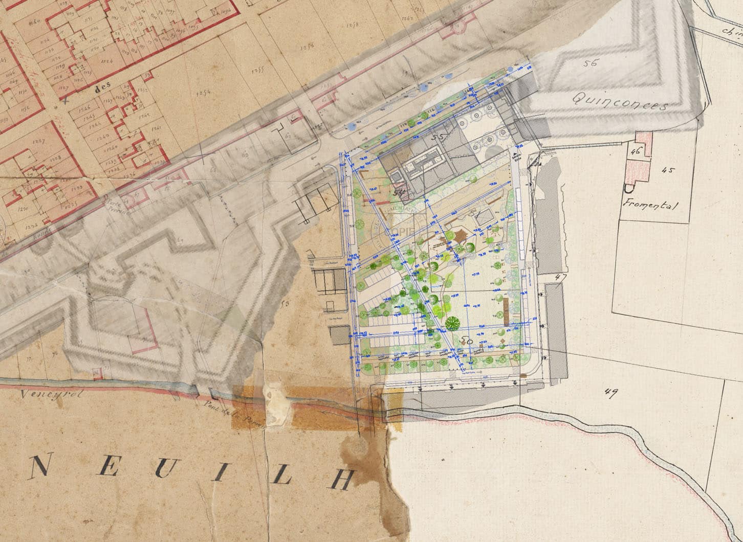 Illustration 1 : superposition des fortifications anciennes avec le plan cadastral ancien et le projet de requalification de la Place du Foirail (crédits : Ville de Sainte-Foy-la-Grande et Société POLLEN Paysages)