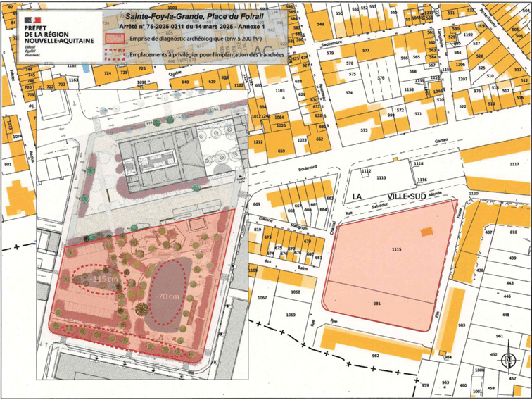Par arrêté en date du 27 février 2025, le Préfet de la région Nouvelle-Aquitaine a prescrit la réalisation d’un diagnostic archéologique sur le site de la place du Foirail. Cette décision fait suite à l’analyse du Service régional de l’archéologie (SRA), qui a estimé que le projet était susceptible d’affecter des vestiges archéologiques relevant des périodes médiévale et moderne.