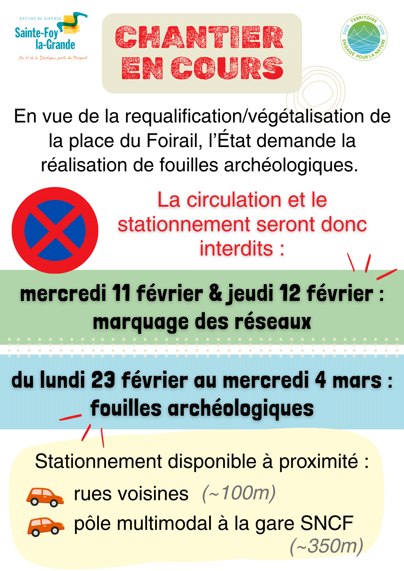 La place du Foirail sera fermée à la circulation et au stationnement uniquement pendant la durée nécessaire aux opérations de marquage, de diagnostic archéologique et de remise en état du site :