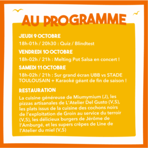 Au programme de cette 1ère édition : des animations gratuites pour tous les publics, différentes tous les soirs, des brasseries artisanales à découvrir, des boissons artisanales sans alcool de Nouvelle-Aquitaine, des stands de restauration locaux et artisanaux avec plusieurs menus proposés, de l'espace pour les familles.