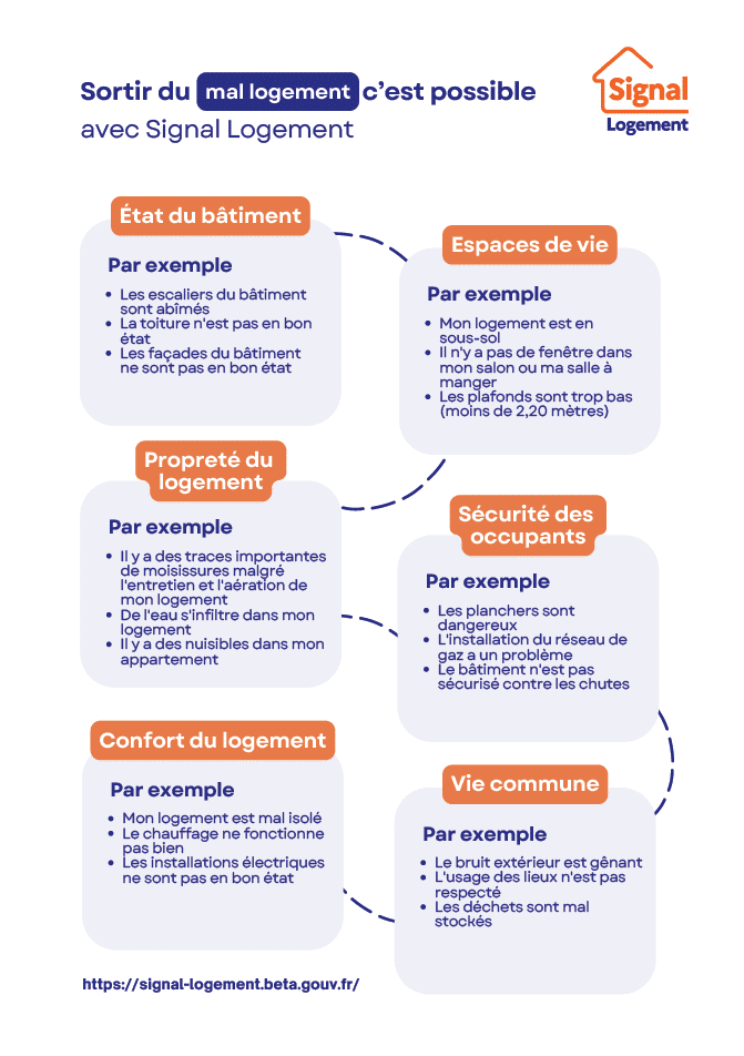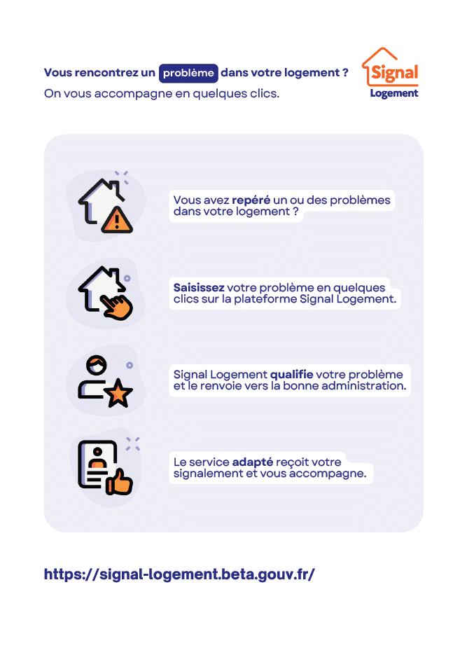 Cette plateforme, entièrement gratuite, est un guichet unique dématérialisé de signalement destiné à toute personne confrontée à une situation de mal logement, aussi bien locataire que propriétaire : sécurité, mauvaise isolation, humidité, présence de nuisibles, absence de chauffage…